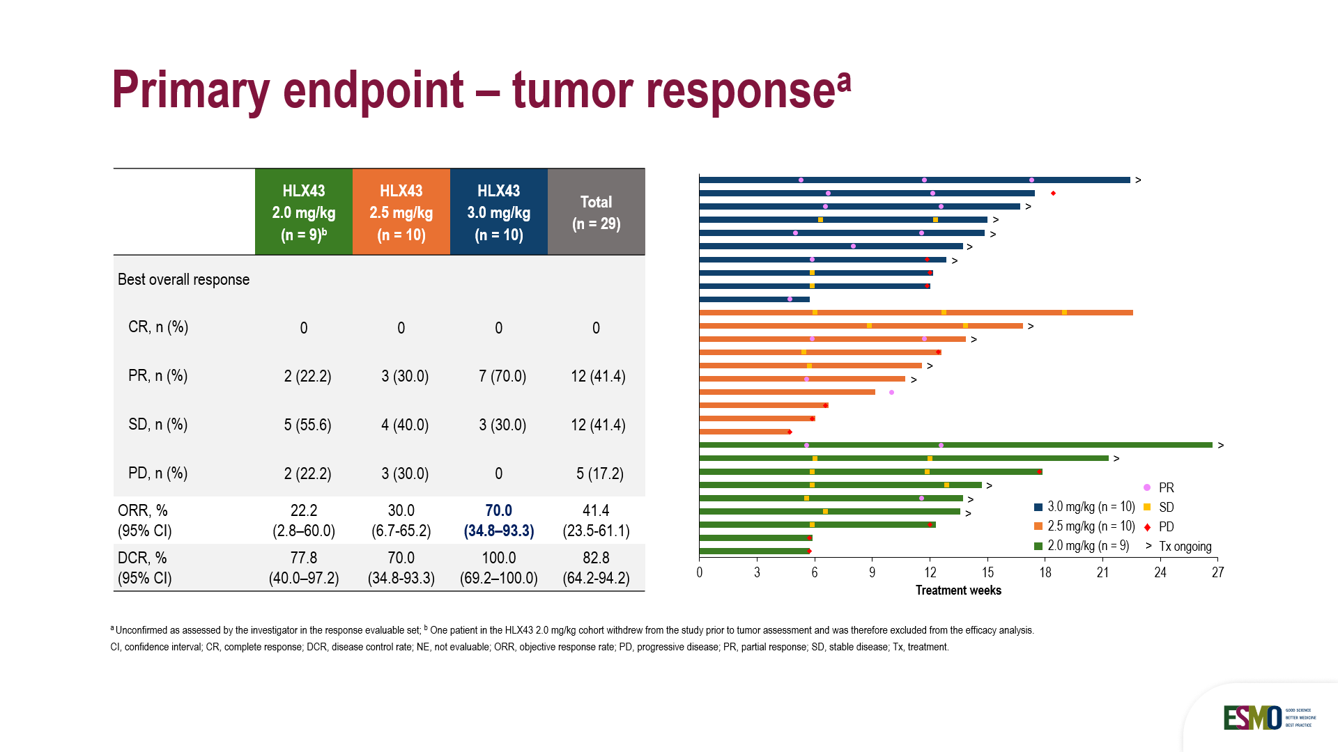 截至2025年9月1日,本研究共纳入30例患者,随机分配接受剂量为2 mg/kg(n=10)、2.5 mg/kg(n=10)和3 mg/kg(n=10)的HLX43治疗。其中超过80%的患者PD-L1综合阳性评分(CPS)≥1。 患者既往接受肿瘤治疗的中位线数为2.0(范围1–4线)。全部患者接受过铂类药物化疗,60%的患者接受过靶向治疗,约50%患者接受过免疫治疗,中位随访时间为3.5个月。