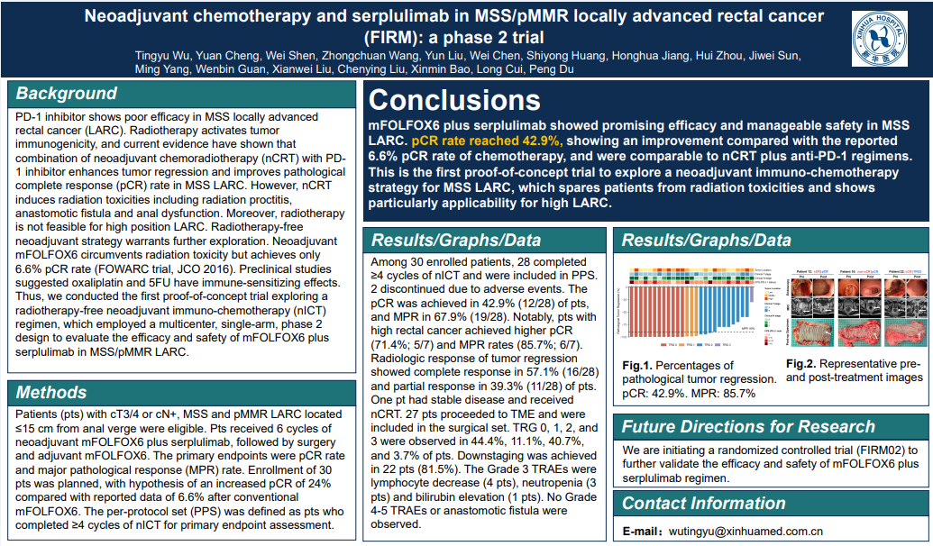 论文题目:新辅助化疗联合斯鲁利单抗用于 MSS/pMMR 局部晚期直肠癌(FIRM 研究):一项 Ⅱ 期临床试验